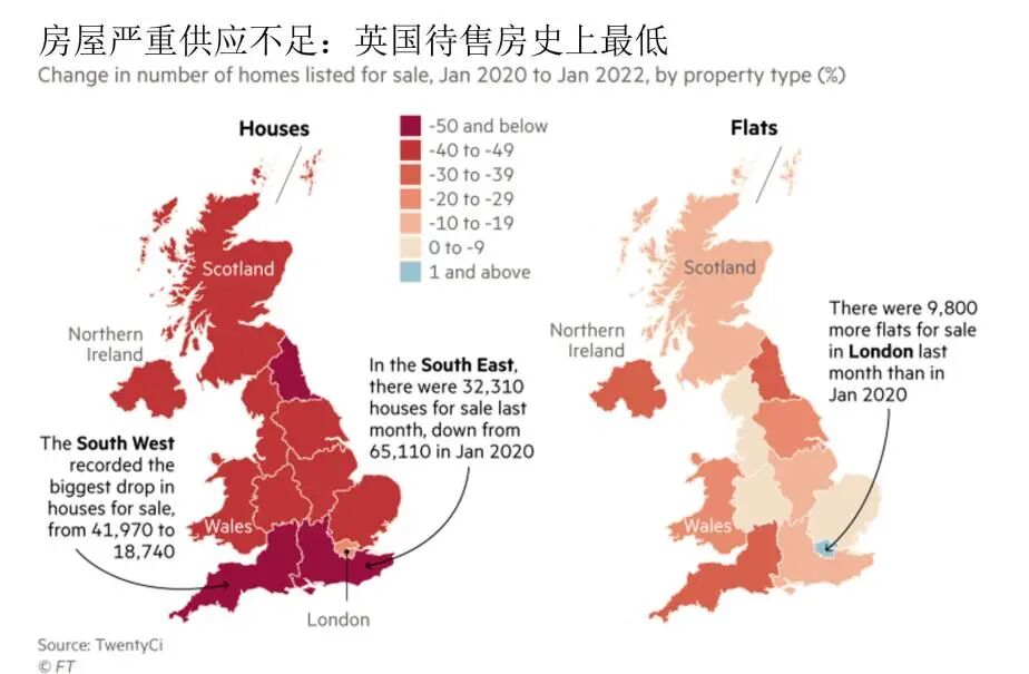 根据TwentyCi的数据,今年年初英国有350,980间待售房屋,相比2020年同期减少了36%。该数据是自2008年以来的历史最低水平。同时,可供出租的房屋数量也处于历史低点。