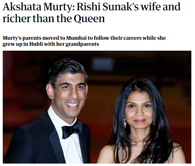 在工党和自由民主党的压力下,苏纳克已经要求对他成为财政部长以来的所有财务报告进行独立审查。然而,这场风暴也让人们看到了十分魔幻的现实:一代人最严重的生活成本危机,正由一位妻子比女王还富有的财政部长来管控。