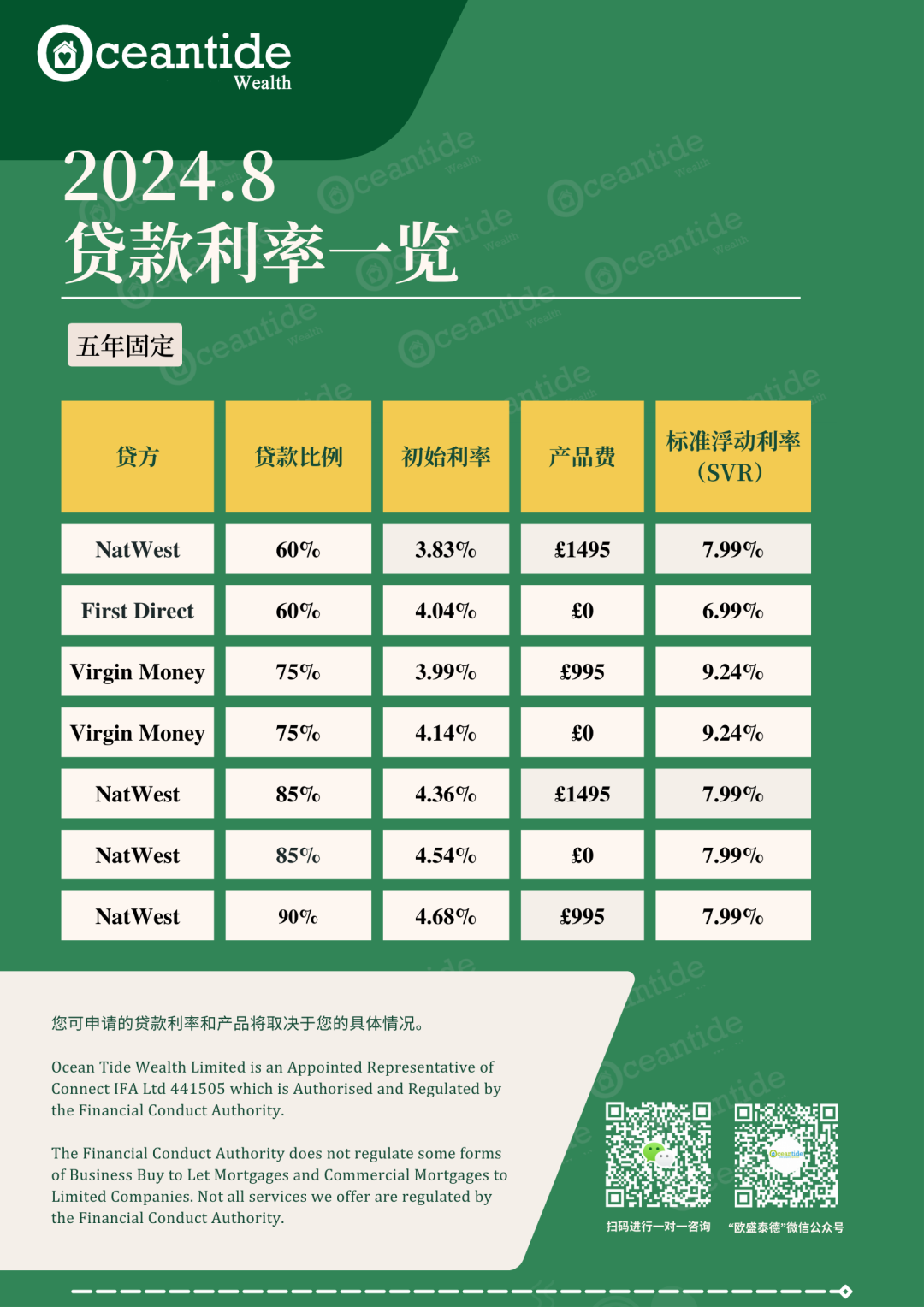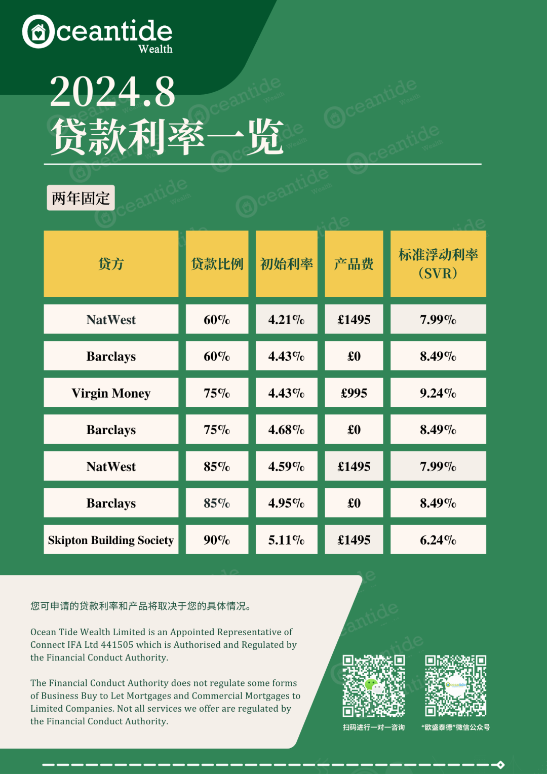 贷方市场的竞争,也给贷款人更多产品选择,以下列举了英国本地多家2年固定利率和5年固定利率贷款产品。但您需要注意,以下这些贷款方案仅供参考,具体您适合的贷款方案需要专业贷款顾问评估后确认。