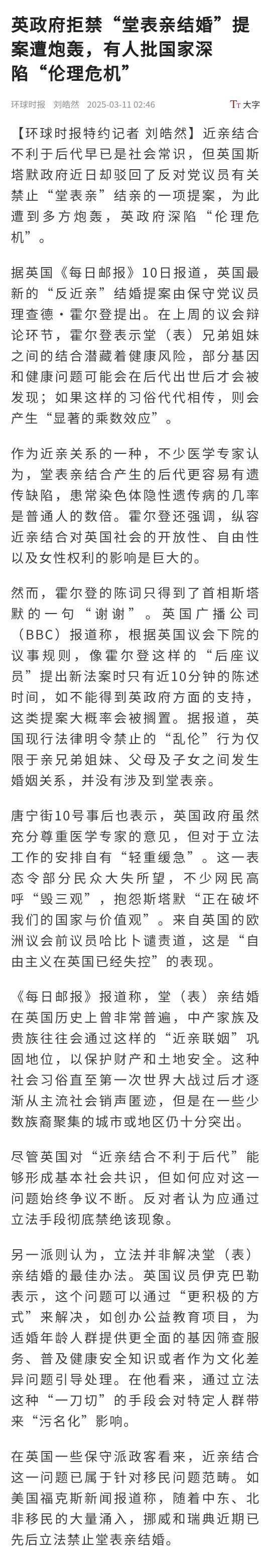 【环球时报特约记者 刘皓然】近亲结合不利于后代早已是社会常识,但英国斯塔默政府近日却驳回了反对党议员有关禁止“堂表亲”结亲的一项提案,为此遭到多方炮轰,英政府深陷“伦理危机”。